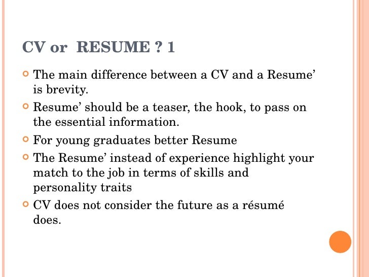 CV or RESUME ? 1 <ul><li>The main difference between a CV and a Resume' is brevity. </li></ul><ul><li>Resume' should be a teaser, the hook, to pass on the ...